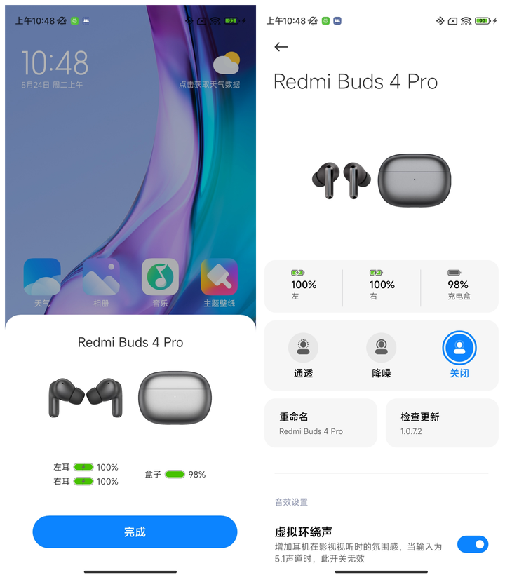 Redmi Buds 4 Pro的配对也非常的方便,小米及Redmi手机用户在首次使用耳机时,开启电池盖就会弹出连接通知,按照步骤连接即可。当连接完毕,在界面上还会显示耳机以及电池盒的电量情况,便于用户对耳机的续航有更好的了解。
