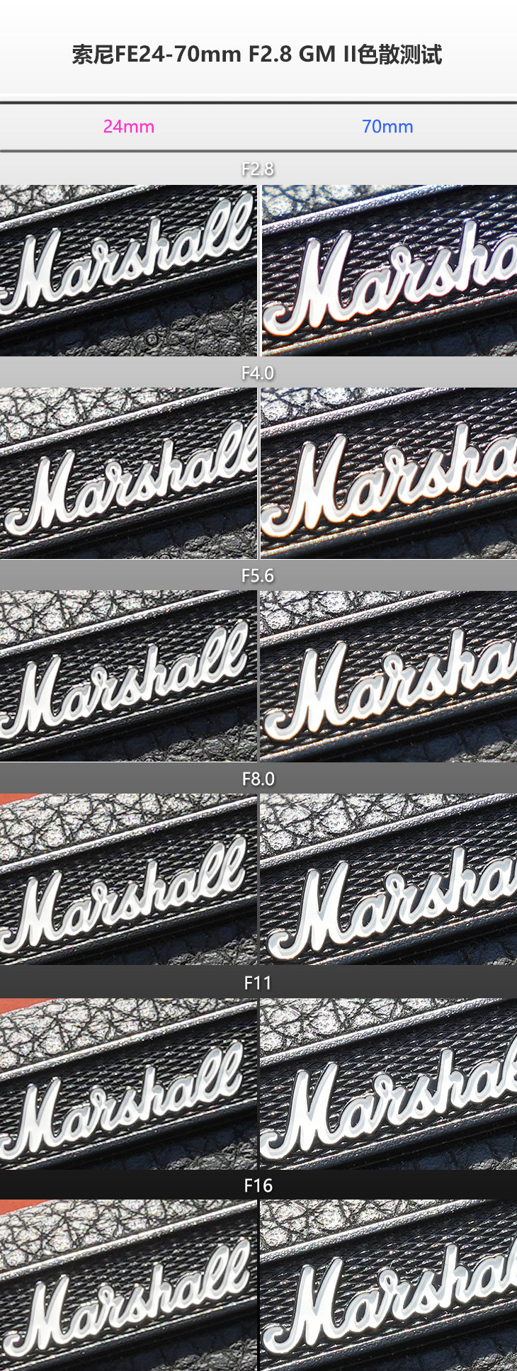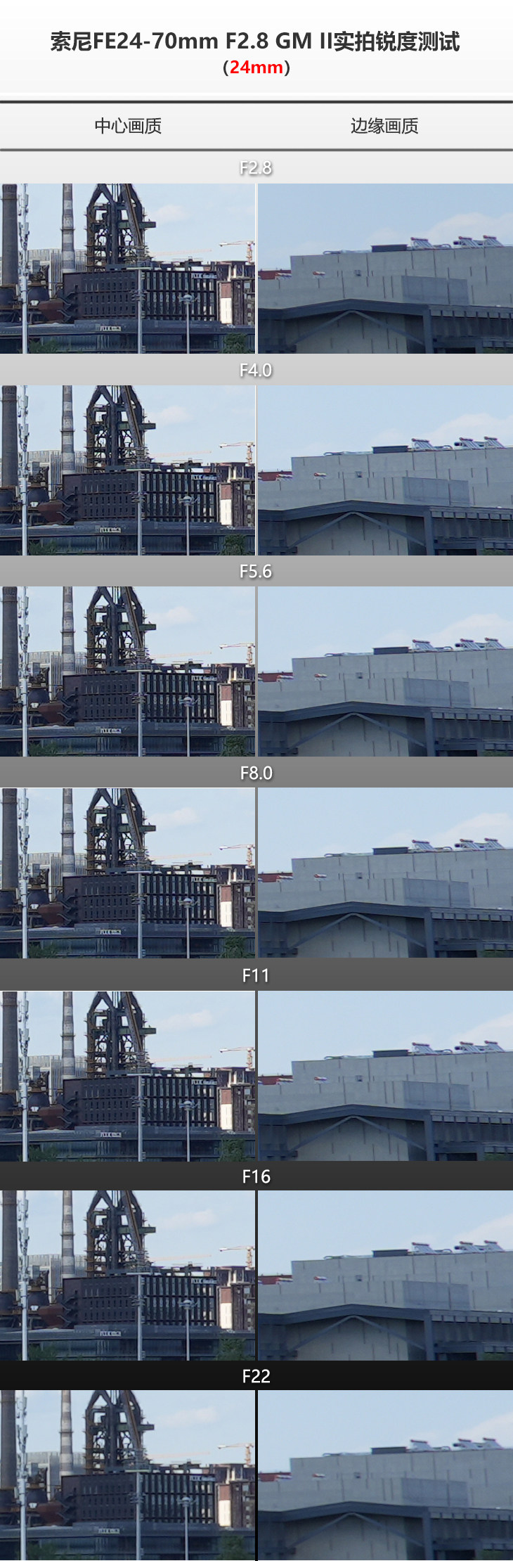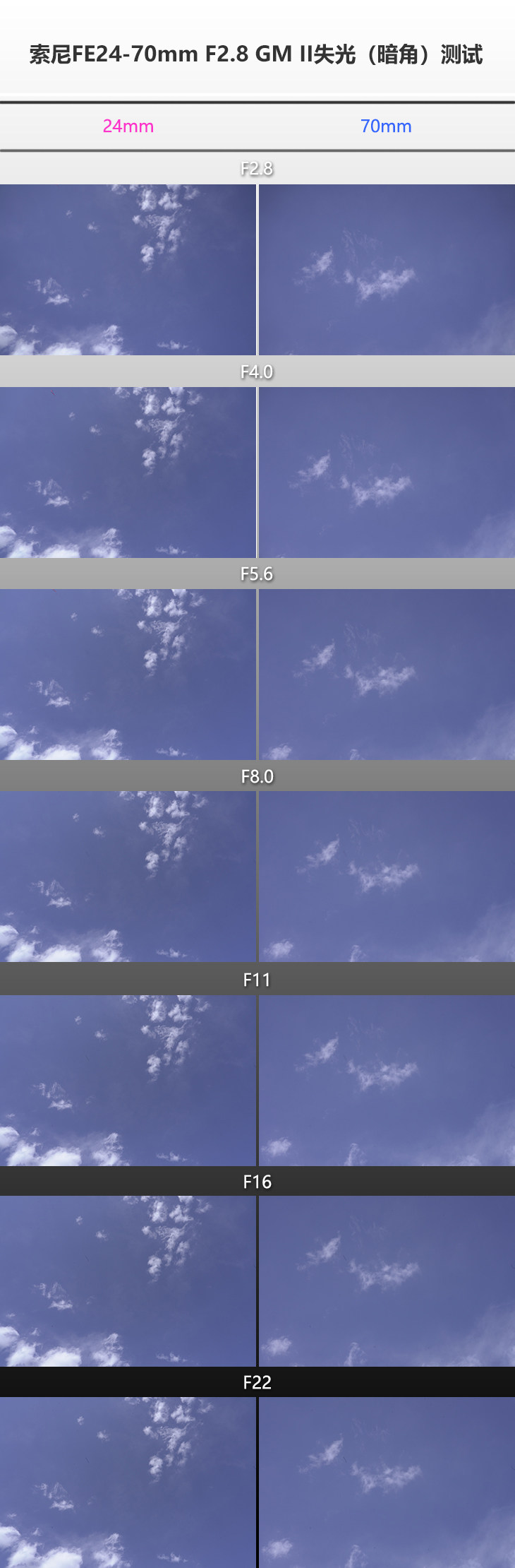 从上面不同光圈下的对比样片来看,镜头在24mm广角端F2.8光圈全开时,四周有出现失光现象,但并不算非常明显,在缩小一档光圈后,基本上可消除暗角;而在70mm端时,和24mm端情况类似,暗角情况同样不算严重,收至F4光圈后无明显暗角。