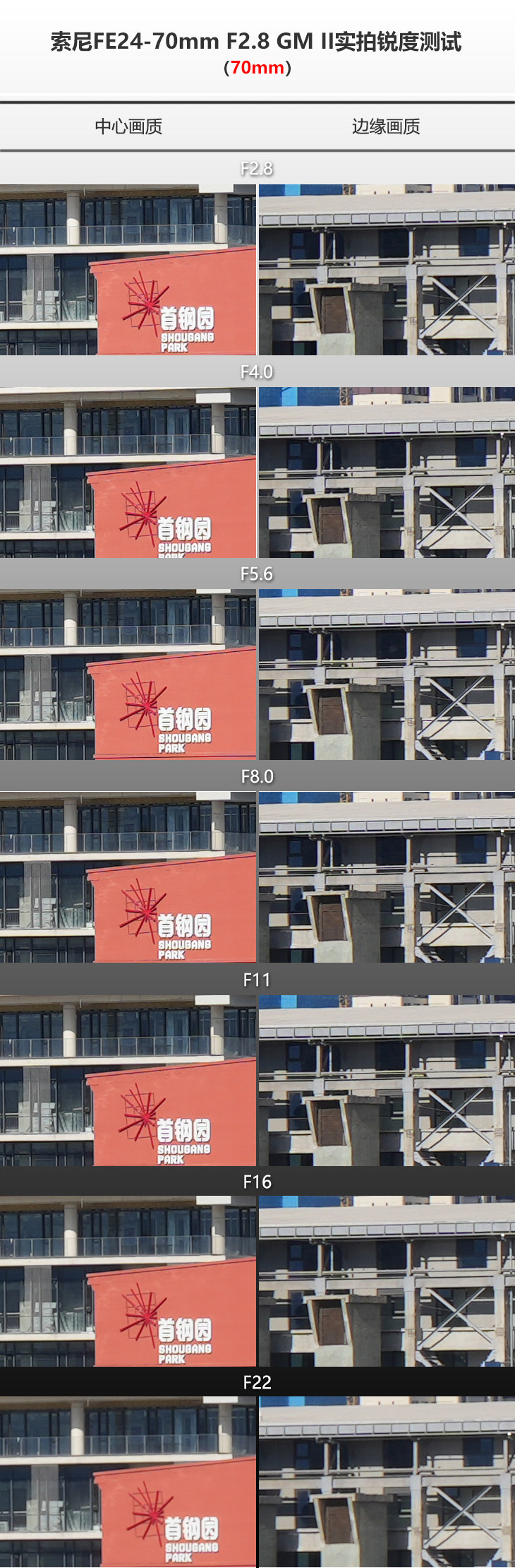 在70mm望远焦段下,索尼FE24-70mm F2.8 GM II光圈全开时,表现与广角端时一样锐利,但当光圈收至F5.6后,中心和边缘画质都展现出该镜头强大的光学素质,F8-F11时则达到最高分辨率。即便是F16-22这样的小光圈下也依然没有因为镜头衍射现象对画面细节造成太大损失,在拍摄一些风光题材时,不用担心过小的光圈对画质造成太大影响。