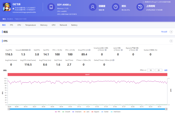 《QQ飞车》也支持120帧模式,画面特效全开。根据PerfDog软件记录结果,游戏平均帧数为116.5帧,游戏全程都能保持很流畅的画面,流畅度方面不用担心。