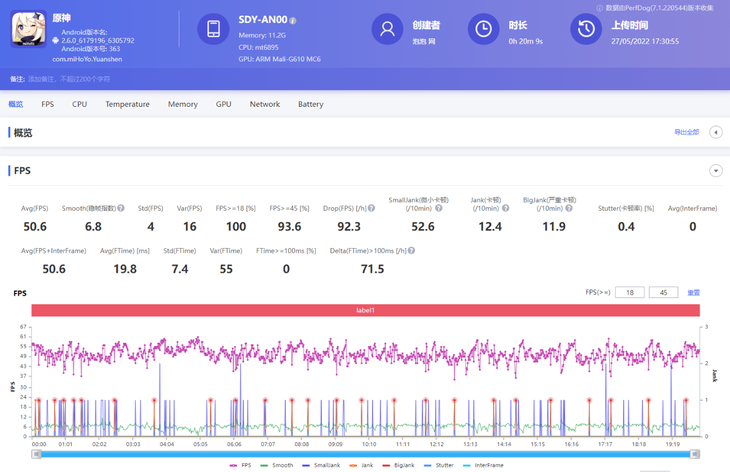 在对游戏要求极高《原神》游戏测试中,采用极高+60帧画质组合,在负载比较高的璃月港游戏场景进行跑图测试。20分钟后,PerfDog软件记录到的平均帧数为50.6帧,有93.6%的时间里帧数都不低于45帧。虽然偶尔会出现一点小卡顿,但整体能够提供不错的画面流畅度。