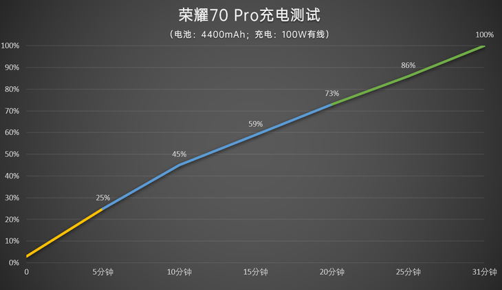 在电量剩余3%的时候开始充电测试,5分钟达到25%的电量,10分钟达到45%的电量,达到100%电量用时31分钟,基本和官方数据一致。充电不用等待很长的时间,平常随时充电几分钟就能获得不少的电量。