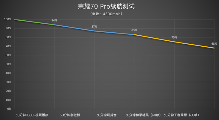 具体耗电情况如上图,经过3个小时续航测试后,剩余电量还有68%,用户日常使用不用时刻担心续航方面的问题。其它配置方面,荣耀70 Pro配备立体双扬声器,支持屏幕指纹识别。