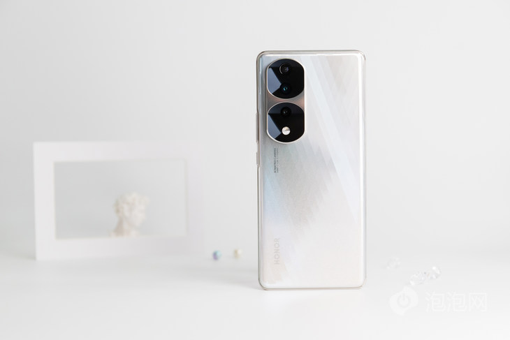 荣耀70 Pro机身背面采用了标志性双镜设计语言,在双镜中引入了扇形对称造型,通过直线与圆弧组合,增加了棱角感,线条更加优雅有个性。后置摄像头模组同时遵循对称美学,保持高辨识度的同时,整体造型比较和谐。