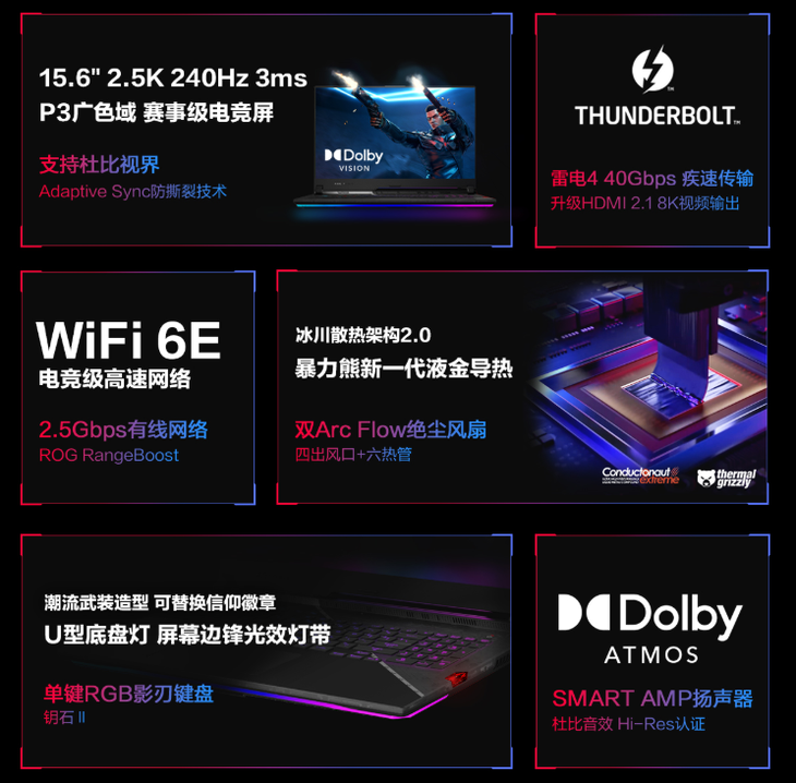 配置出色的同时,ROG枪神6也带来了优秀的显示能力,其搭载了一块15.6英寸2.5K 240Hz 3ms赛事级电竞屏,不仅显示精细,而且具备高刷新率、快速响应的优势,为玩家呈现最佳的游戏画面。同时屏幕支持100%DCI-P3色域,支持杜比视界以及DC调光,综合表现也相当出色。
