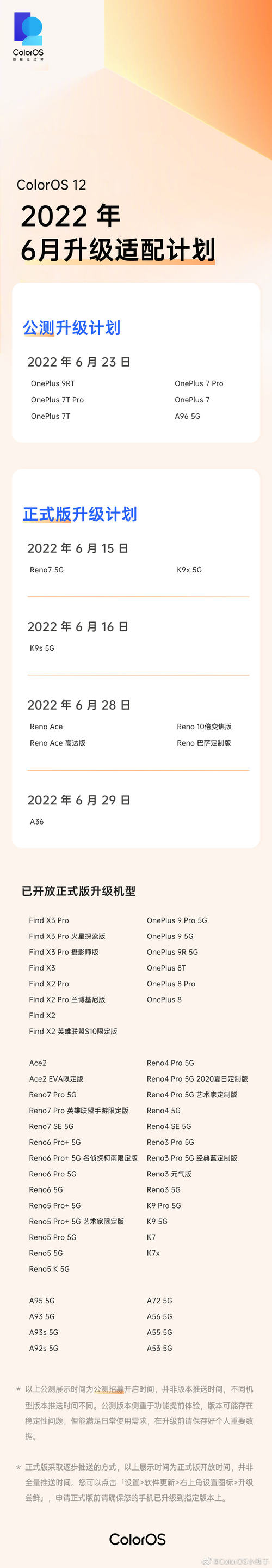 ColorOS 12正式版升级计划时间和机型信息如下。