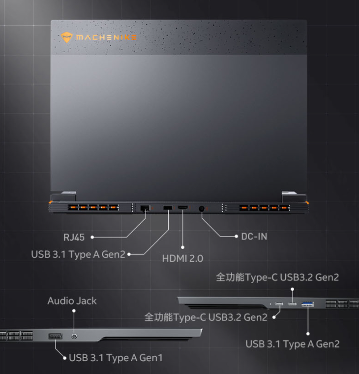 其它方面,这款笔记本提供四区调光RGB键盘,内置80Wh电池,接口包括两个全功能Type-C、3个Type-A、HDMI 2.0、RJ45、音频接口等。