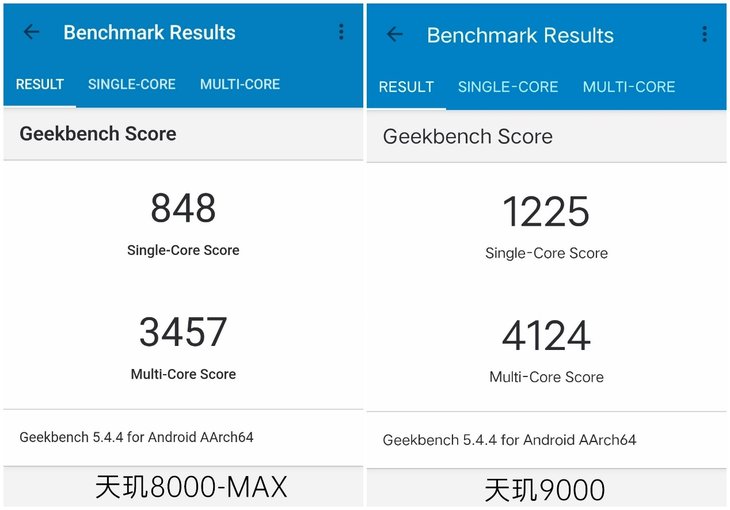 天玑8000-MAX机型GeekBench 5单核跑分848,多核跑分3457。天玑9000机型GeekBench 5单核跑分1225,多核跑分4124。无论是单核或者多核理论性能,天玑9000都与天玑8000-MAX拉开不小距离。