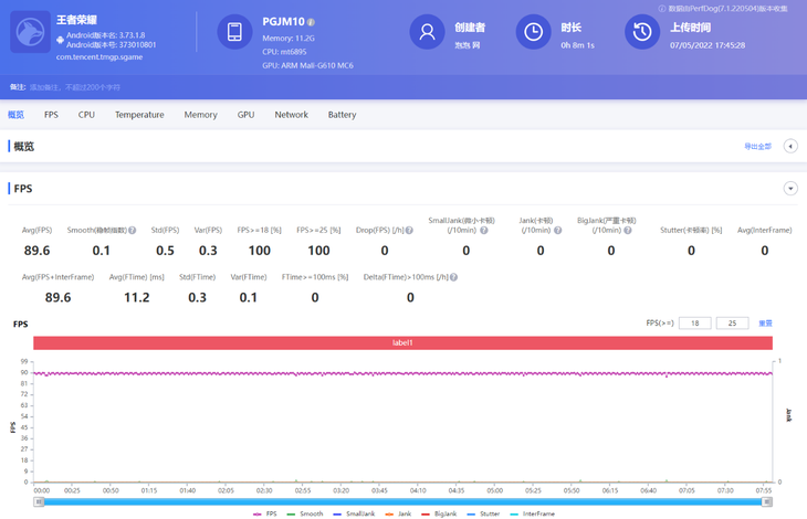 在实际性能表现上,搭载天玑8000-MAX机型在《和平精英》90帧游戏中,平均帧率能保持在89.4帧,帧数全程都十分稳定,波动小,能够带来持续稳定的流畅高帧画面。天玑8000-MAX测试机型目前《王者荣耀》只支持90帧高帧模式,游戏平均帧数达到89.6帧,帧数同样很稳定。
