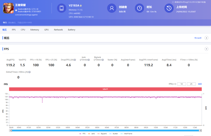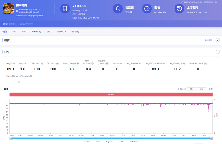 同样,天玑9000的性能玩《王者荣耀》、《和平精英》高帧模式也是没有任何压力的,PerfDog软件记录到天玑9000机型平均帧数分别为119.2帧以及89.3帧,波动同样很小。