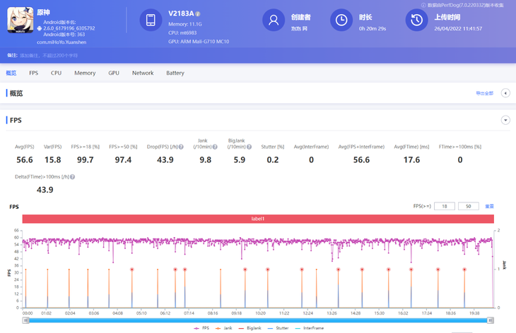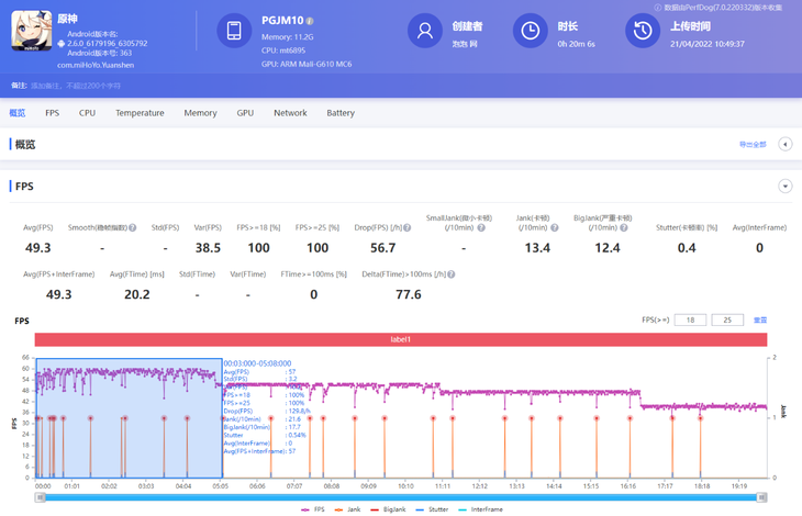 在负载更高的游戏中,天玑8000-MAX机型在极高画质+60帧设置下,玩《原神》20分钟,PerfDog软件记录到的平均帧数为49.3帧。前5分钟平均帧可达57帧左右,性能释放激进。后面因为温度上升,出现了阶段性锁帧,接近20分钟游戏后,帧率维持在40帧左右。