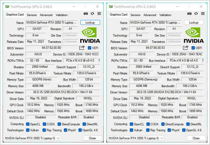 特别是,通过GPU-Z来看,这两款游戏本所搭配的RTX 3050 Ti笔记本电脑GPU的规格也是一模一样的,都是最大95W性能输出,都是运行在PCIe4.0 x8模式下。