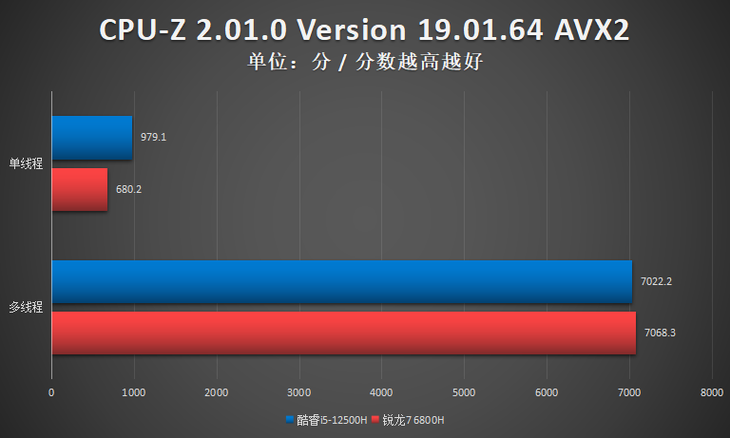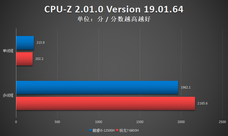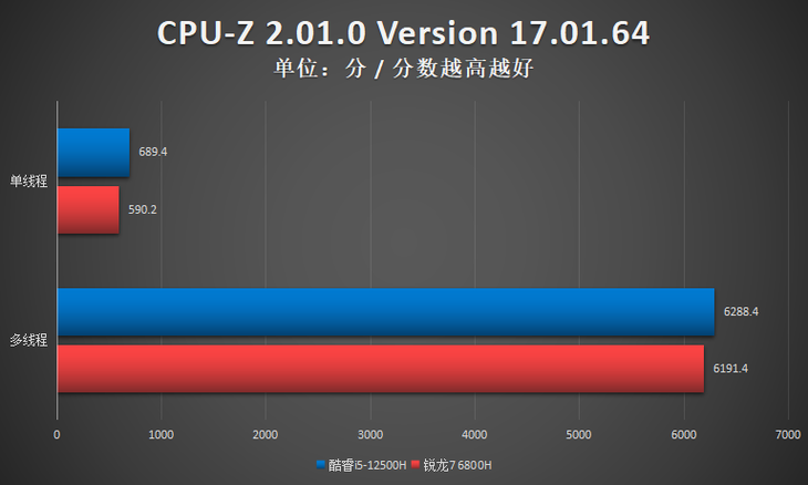 测试小结:从CPU-Z的性能测试来看,酷睿i5-12500H与锐龙7 6800H互有优势项目。总体来看酷睿i5-12500H小优于锐龙7