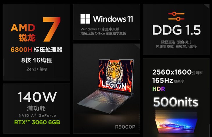 配置方面,联想拯救者R9000P采用了锐龙7 6800H处理器,拥有8核16线程,最高频率可达4.7GHz。显卡方面则是配备了GeForce RTX 3060笔记本电脑GPU,同样可以达到140W的全功率输出。