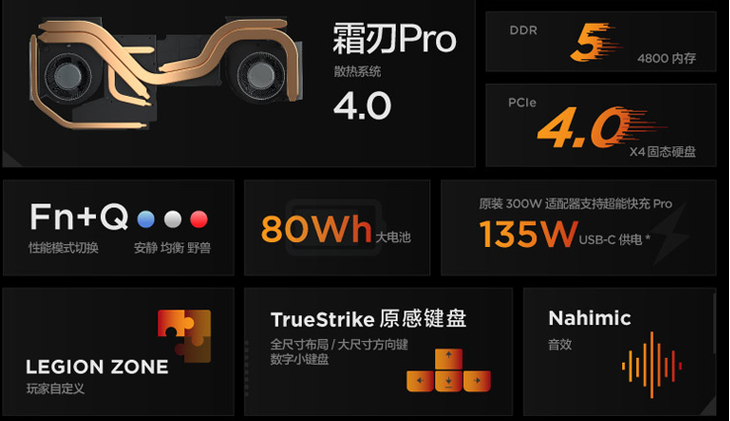 其他配置方面,联想拯救者R9000P搭载了16GB 4800MHz DDR5内存以及512GB PCIe 4.0 SSD,拥有80Wh电池,支持135W的快速充电。