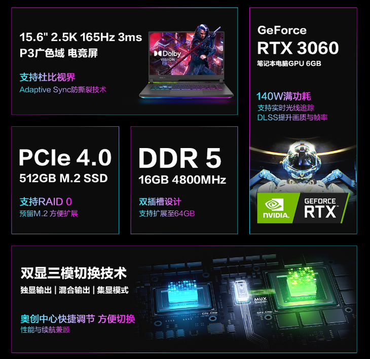 魔霸新锐2022是ROG主推的游戏本之一,其搭载了AMD锐龙9 6900HX处理器,拥有8核16线程,最高频率达到4.9GHz,疾速响应多任务处理。与之搭配的是NVIDIA GeForce RTX 3060笔记本电脑GPU,6GB GDDR6显存,140W满血输出,支持实时光线追踪以及DLSS,为游戏玩家带来流畅稳定的游戏体验。