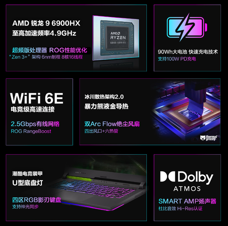 其他配置方面,魔霸新锐2022搭载了16GB 4800MHz DDR5内存以及512GB PCIe 4.0 SSD,配备90Wh大电池,支持100W PD快充,支持WiFi 6E,拥有四区RGB影刃键盘,搭载冰川散热架构2.0,散热更高效。