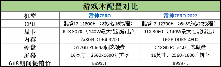 这里还是以雷神ZERO机型为了,同样花8999元,12代酷睿机型只能买到RTX3060笔记本GPU,而你如果选择抄底11代酷睿机型,便可以买到RTX3070笔记本GPU。