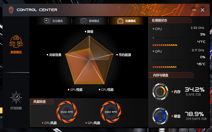在测试之前,笔者均将这两款游戏本开启了独显直连模式,电脑运行模式均开启的是“狂暴模式”。