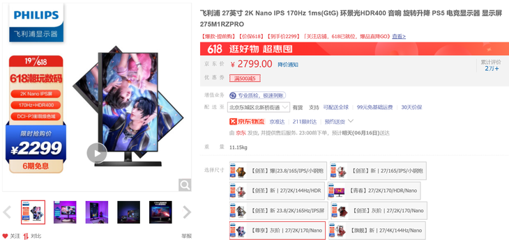 飞利浦275M1RZPRO电竞显示器 京东618优惠价:2299元>>点击购买