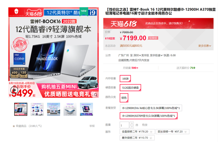 轻薄本携带起来非常方便,适合经常需要外出的用户。雷神T-Book 16不仅有轻薄本的便携性,还拥有强大性能加持,适合对性能要求比较高的用户。雷神T-Book 16目前正参与天猫618狂欢活动,i9-12900H/A370M独显版狂欢价7199元,叠加各种优惠后,到手价低至6199元。