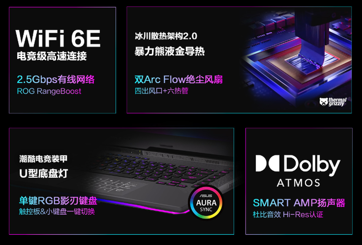 其他配置方面,ROG魔霸6内置90Wh大电池,支持100W PD快充,出门在外也可快速补血。WiFi 6E+2.5G RJ45接口,有线无线双疾速上网。另外还有单键RGB影刃键盘和U型底盘灯,支持神光同步,装甲电竞感十足。