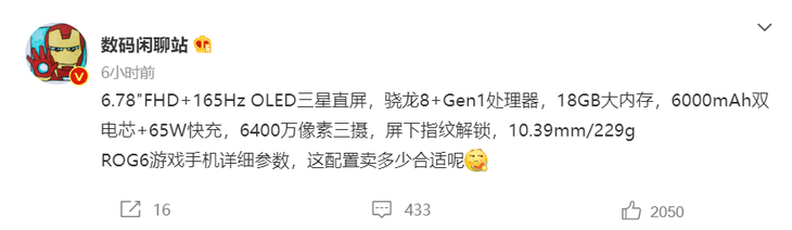 华硕ROG游戏手机6详细配置曝光:骁龙8+Gen1,165Hz直屏