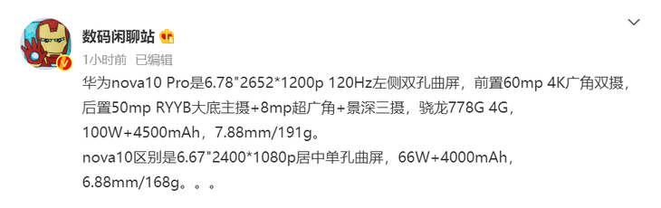 据@数码闲聊站爆料信息,华为nova10 Pro配备6.78英寸2652*1200分辨率120Hz左侧双孔曲屏,前置为6000万像素 4K广角双摄,后置采用5000万像素 RYYB大底主摄+800万像素超广角+景深三摄,采用骁龙778G 4G处理器,配备100W充电+4500mAh电池,机身厚度和重量为7.88mm/191g。