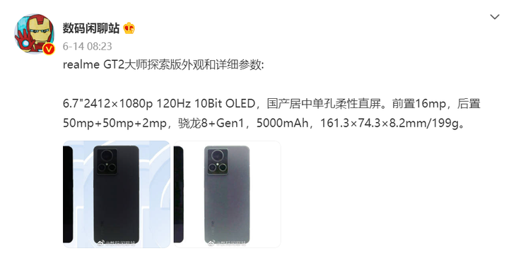 爆料信息还提到,真我GT2大师探索版搭载骁龙8+Gen1芯片,标配100W快充头,内置5000mAh双芯电池,前置为1600万像素镜头,后置为5000万像素+5000万像素+200万像素三摄组合。