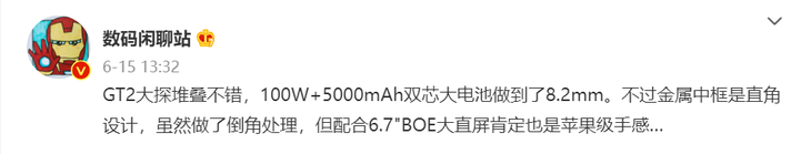 根据@数码闲聊站爆料信息,真我GT2大师探索版搭载6.7英寸120Hz 10bit BOE蓝钻柔性直屏,居中单打孔超窄边框设计,分辨率为2412×1080。手机为直角金属中框设计,尺寸为161.3×74.3×8.2mm,重量199g。