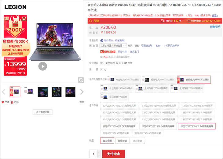 酷睿i7-11800H处理器联袂RTX3080笔记本电脑GPU的机型,目前处于预售状态,售价13999元。
