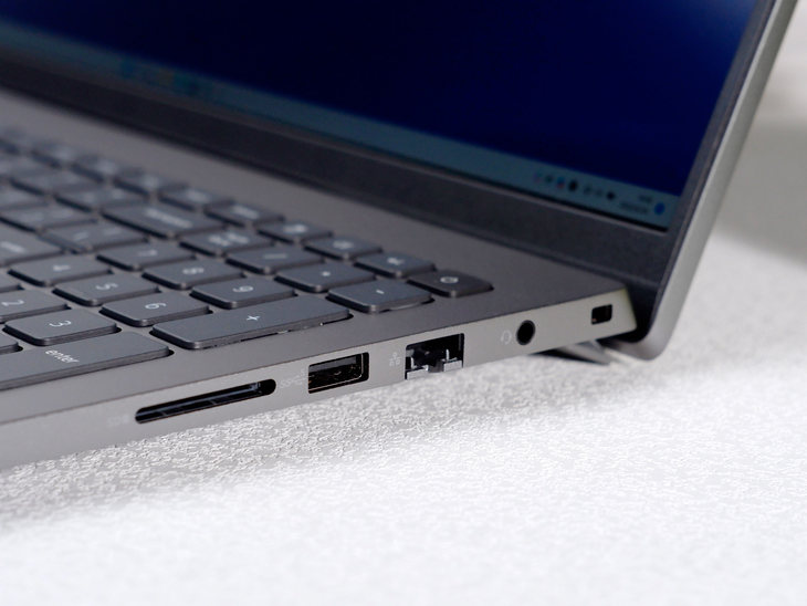 它的机身右侧设计了一个笔记本锁孔、一个3.5mm耳机接口、一个网线接口、一个USB3.2接口、一个SD读卡器接口。