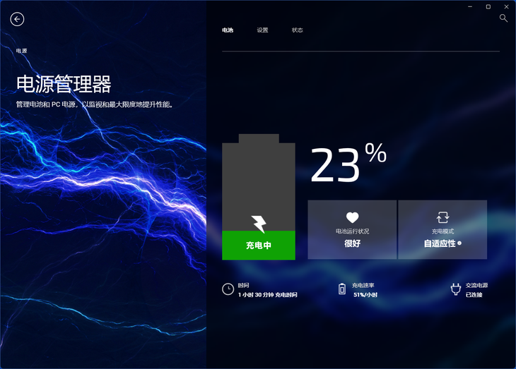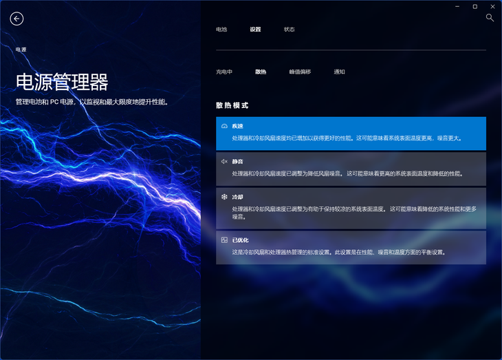 在功率界面下,可以对电池、散热模式等方面进行设置。