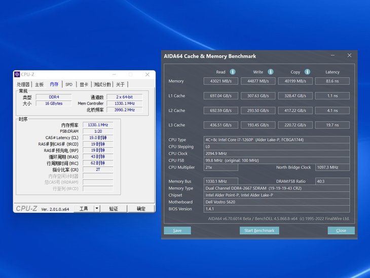 值得注意的是,AIDA64 Cache&Memory Benchmark显示的内存频率为DDR4-2667MHz,跟这款大屏商务本标称的DDR4-3200MHz内存频率对不上号。其实,这是因为12代酷睿P系列“准标压”处理器支持SAGV技术,系统会根据负载智能选择内存速度。