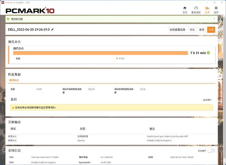 5这两款软件测试可知,酷睿i7-1260P处理器性能足够强劲,应对当今大部分移动办公应用均是游刃有余的。