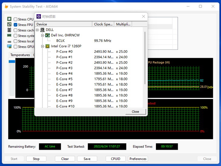 单烤处理器。开启FPU烤机10分钟之后,这款大屏商务本的CPU温度稳定在了约82℃左右,性能核频率最高能到2.493GHz,能效核频率最高能到1.895GHz,此时CPU功耗稳定在了28W。