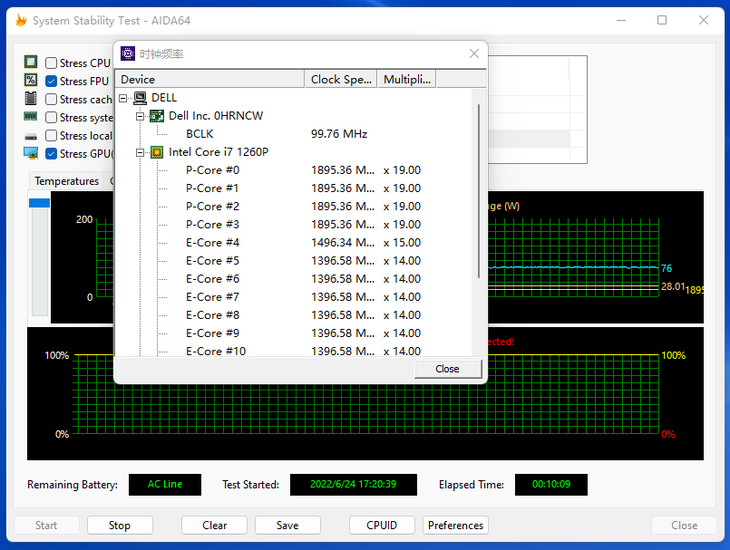 对处理器和显卡进行双烤。开启FPU+GPU烤机10分钟之后,这款大屏商务本的CPU温度稳定在了约76℃左右,性能核频率最高能到1.895GHz,能效核频率最高能到1.496GHz,此时CPU功耗稳定在了28W。