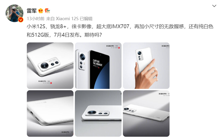 雷军公布小米12S白色版渲染图:骁龙8+,徕卡影像加持
