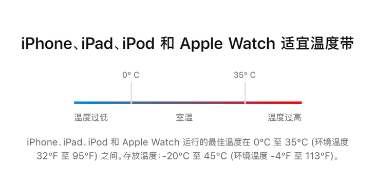 此外,要想拥有更好的电池寿命,需要保持手机在适宜的环境温度。在苹果官网电池介绍页面中,iPhone手机运行最佳温度在0到35度之间,尽量避免设备在超过35度的环境充电,高温环境充电有可能会损坏电池容量。