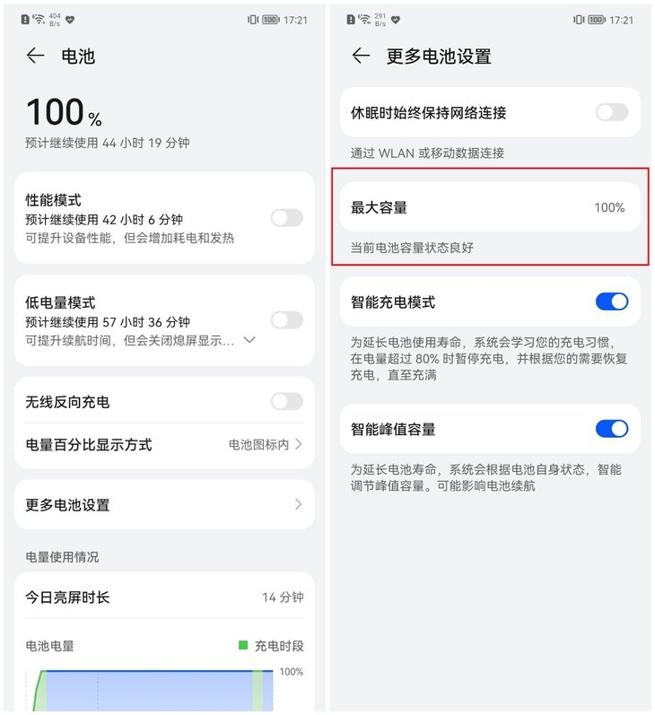 华为手机在设置-电池-更多电池设置中能够看到最大容量,通过百分比的形式显示。