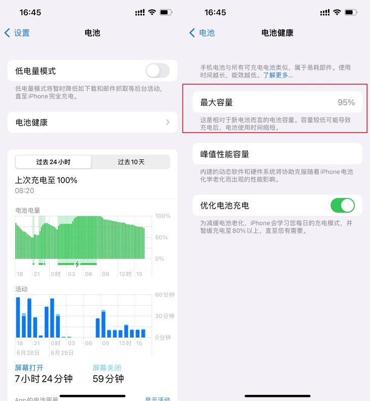 iPhone在设置的电池-电池健康中,也能看到电池最大容量,同样是百分比的形式显示。iPhone电池最大容量低于80%的时候,可以考虑换电池。