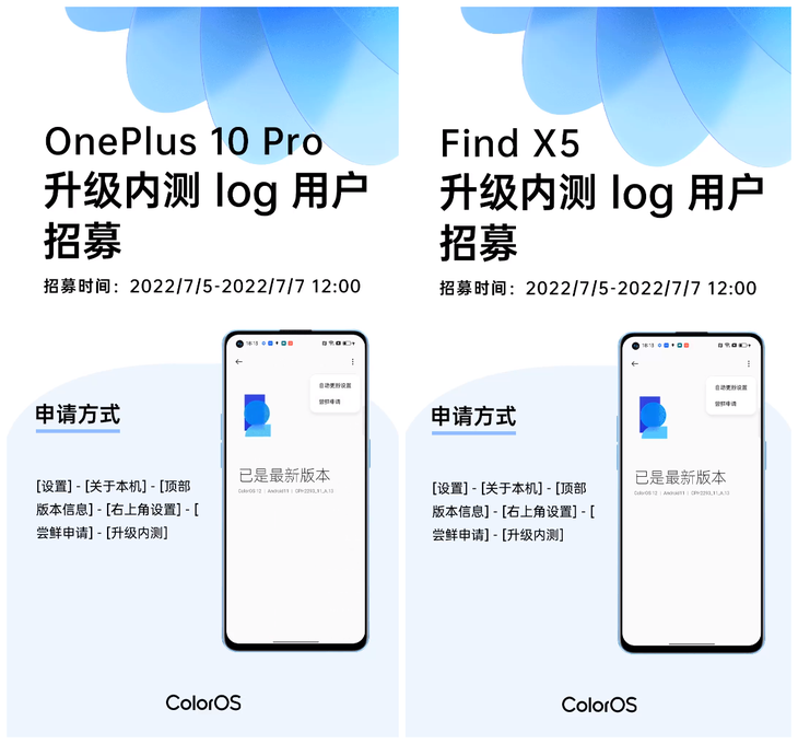 7月6日消息,官方宣布,一加10 Pro和Find X5两款机型升级内测log版本招募来了。
