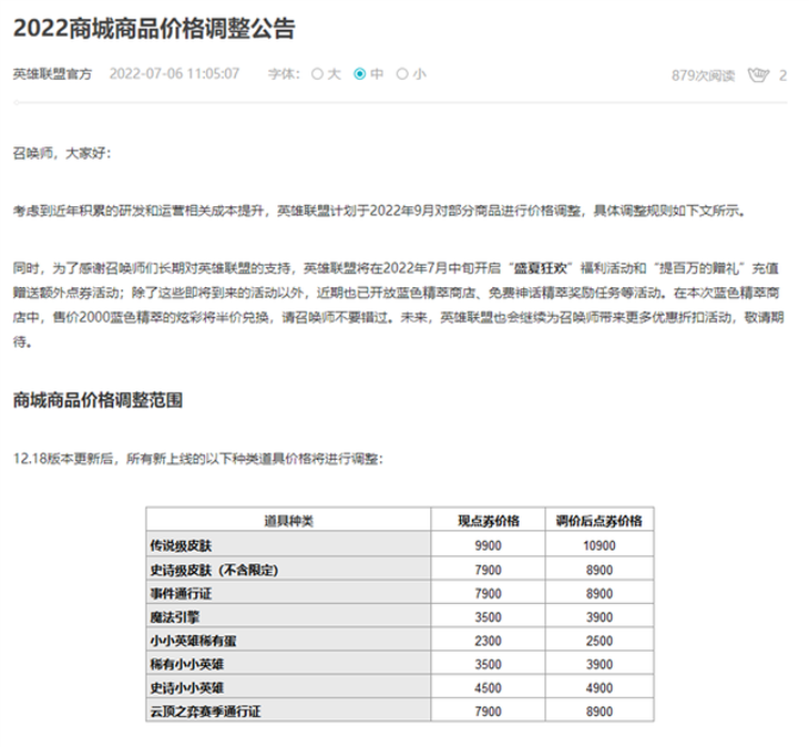 继美服《英雄联盟》点券价格上涨后,国服《英雄联盟》官方今日也发布了“2022商城商品价格调整公告”。公告指出,考虑到近年积累的研发和运营相关成本提升,英雄联盟计划于2022年9月对部分商品进行价格调整。