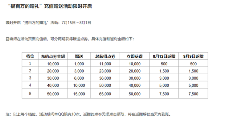 据了解,预计12.18版本更新时间为2022年9月22日,在价格调整同时,部分商城在售皮肤价格将下调。值得一提的是,官方还会在7月15日-8月1日限时开启“提百万的赠礼”活动,用户在活动页面充值后,可分两期获得赠送点券,每个档位活动期间单QQ限充10次。