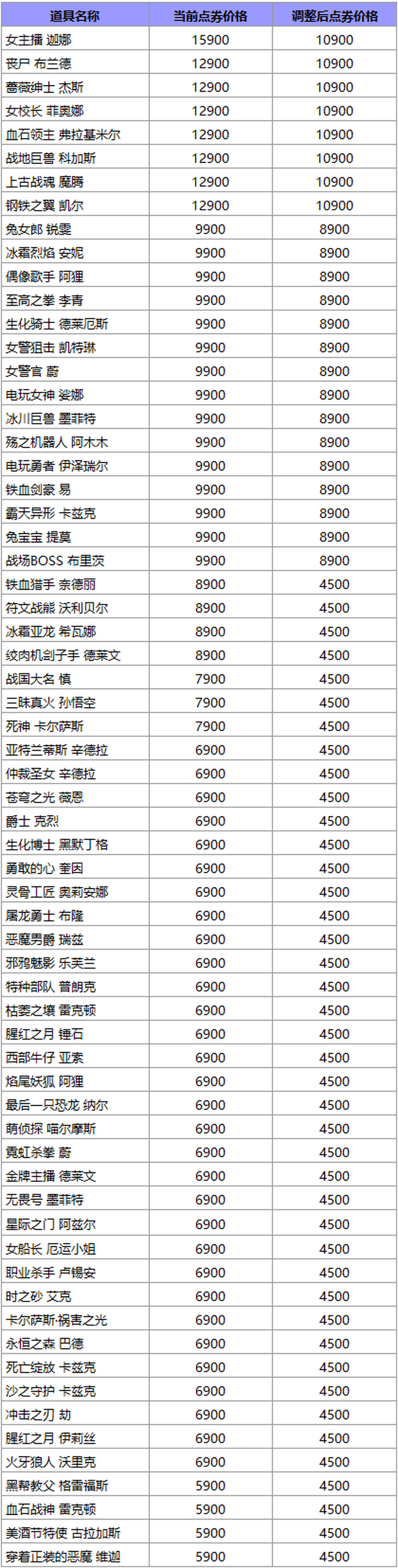 部分皮肤价格下调