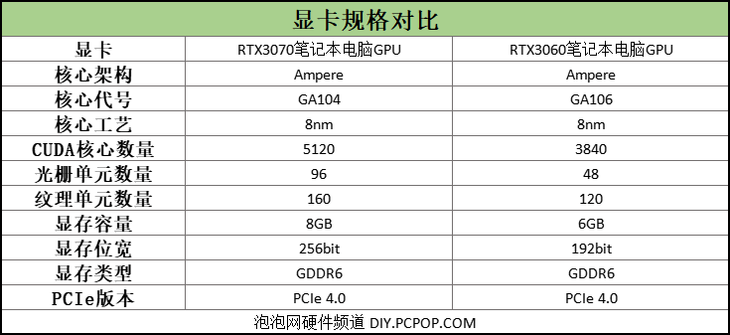 对比RTX3060笔记本电脑GPU,RTX3070笔记本电脑GPU在GPU规格和显存规格方面均要强大不少。