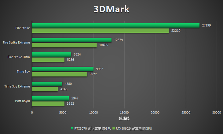 3DMark成绩一目了然,RTX3070笔记本电脑GPU相比RTX3060笔记本电脑GPU出色很多。