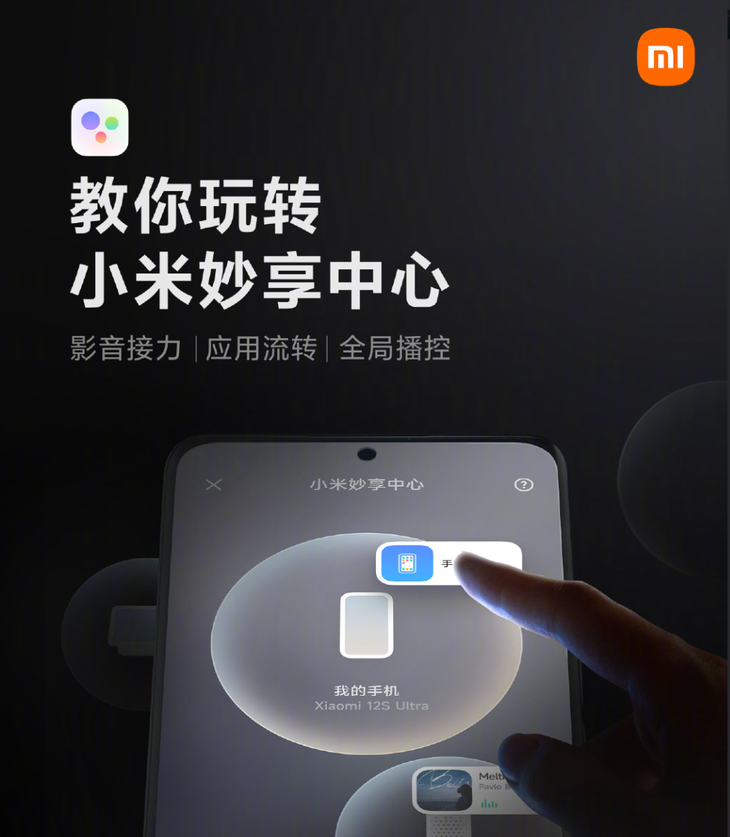 在手机/平板从右上角下拉通知栏,进入控制中心找到“小米妙享中心”卡片或按钮就能进入该功能,小米妙享中心支持影音接力、应用流转、全局播控功能。