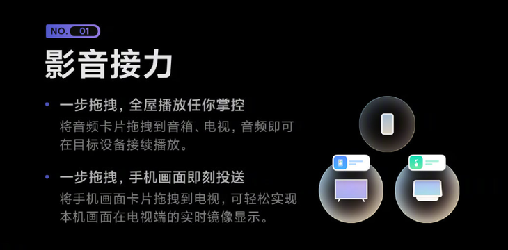 通过小米妙享中心影音接力功能,可实现一步拖拽。把音频卡片拖拽到音箱、电视,音频即可在目标设备接续播放。把手机画面卡片拖拽到电视,可轻松实现本机画面在电视端的实时镜像显示。