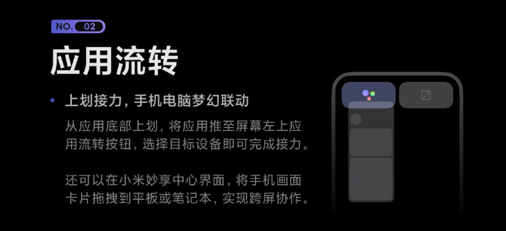 小米妙享中心支持应用流转,从应用底部上划,将应用推至屏幕左上应用流转按钮,选择目标设备即可完成接力。小米妙享中心还支持全局播控,点击音乐卡片、设备泡泡可快捷完成播放控制、设备遥控等操作。